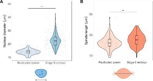 Figure 3—figure supplement 2 Nuclei and spindles do not scale with mitotic chromosome size in egg extracts. (A) Diameters of replicated sperm nuclei or stage 8 embryo nuclei measured just before addition to metaphase egg extracts. (B) Lengths of spindles formed around either replicated sperm nuclei or embryo nuclei in metaphase egg extracts. n = 3 biological replicates, >25 structures per replicate. ***p<0.001, **p=0.004 by the Mann–Whitney U test. Source data are available in Figure 3—source data 1. |