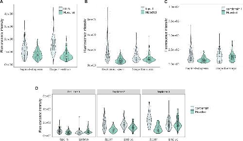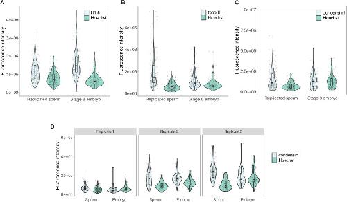 Figure 3—figure supplement 3 Raw fluorescence intensities for embryo vs. sperm immunofluorescence. (A–C) Background-subtracted fluorescence intensities for data presented in Figure 3D, with protein of interest and Hoechst signals plotted separately. n = 3 biological replicates, >50 chromosomes per replicate. (D) Raw intensities for three biological replicates of condensin I immunofluorescence experiment. Source data are available in Figure 3—source data 1. |