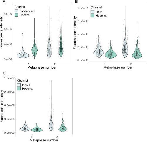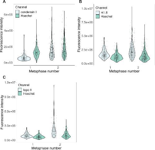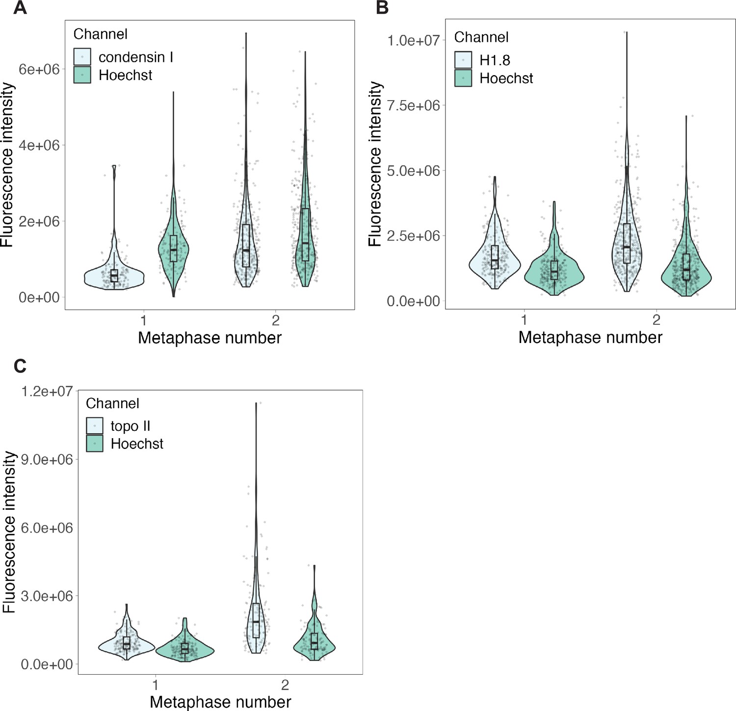 Figure 3—figure supplement 6 Raw fluorescence intensities for anaphase experiments. Background-subtracted fluorescence intensities for immunofluorescence of (A) condensin I, (B) H1.8 and (C) topo II presented in Figure 3—figure supplement 5D–F. Protein of interest and Hoechst signals are plotted separately. n = 3 biological replicates, >50 chromosomes per replicate. Source data are available in Figure 3—source data 1. |
