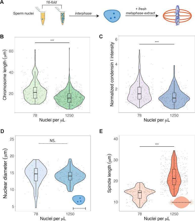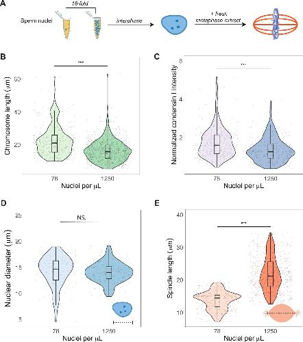 Figure 5. Nuclear-cytoplasmic ratio regulates mitotic chromosome scaling, but not nuclear or spindle scaling.(A) Concentration of sperm nuclei in egg extracts was varied 16-fold to mimic concentrations found in early (78 nuclei/μL) vs. late (1250 nuclei/μL) blastula stages. (B) Quantification of mitotic chromosome lengths and (C) condensin I abundance in extracts containing high or low concentrations of sperm nuclei (difference in median intensity is 1.6-fold). (D) Nuclear diameters for samples containing low or high concentrations of sperm nuclei. (E) Spindle lengths for samples containing low or high concentrations of sperm nuclei. n = 3 biological replicates, >50 structures per replicate, ***p<0.001 by the Mann–Whitney U test. NS denotes p=0.09. Source data are available in Figure 5—source data 1. Figure 5—source data 1. This file contains all of the source data for Figure 5 and related supplemental figures. |