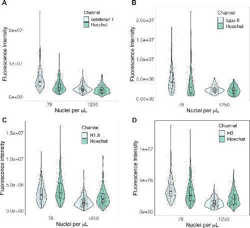 Figure 5—figure supplement 2 Raw fluorescence intensities for nuclear-cytoplasmic (N/C) ratio experiments. Background-subtracted fluorescence intensities for immunofluorescence of (A) condensin I, (B) topo II, (C) H1.8 and (D) H3 presented in Figure 5C and Figure 5—figure supplement 1A-C. Channels for protein of interest and Hoechst plotted separately. n = 3 biological replicates, >50 chromosomes per replicate. Source data are available in Figure 5—source data 1. |