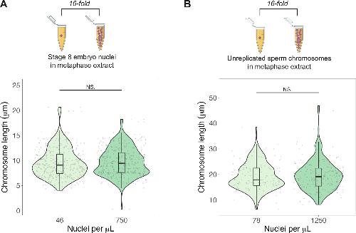 Figure 5—figure supplement 3 Nuclear-cytoplasmic (N/C) ratio does not affect chromosome lengths of embryo chromosomes or unreplicated sperm chromosomes. (A) Top: schematic of experiment—stage 8 embryo nuclei were added to metaphase egg extracts at N/C ratios spanning a 16-fold range. Bottom: quantification of mitotic chromosome lengths in samples containing high or low concentrations of stage 8 embryo nuclei. (B) Top: schematic of experiment—unreplicated sperm chromosomes were added to metaphase egg extracts at N/C ratios spanning a 16-fold range. Bottom: quantification of mitotic chromosome lengths in samples containing high or low concentrations of unreplicated sperm nuclei. n = 3 biological replicates, >50 chromosomes per replicate. For both plots, NS denotes p>0.5 by the Mann–Whitney U test. Source data are available in Figure 5—source data 1. |