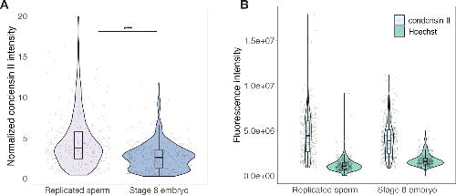 Figure 3—figure supplement 4. Immunofluorescence of condensin II on sperm vs. embryo chromosomes formed in egg extracts.(A) Condensin II intensities of replicated sperm or stage 8 embryo chromosomes, normalized to Hoechst signal. (B) Raw fluorescence intensities for condensin II (xCAP-G2) or Hoechst for the data shown in (A). n = 3 biological replicates, >50 chromosomes per replicate. ***p<0.001 by the Mann–Whitney U test. Source data are available in Figure 3—source data 1. |