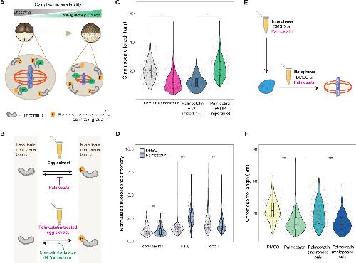Figure 6. Importin α partitioning scales mitotic chromosomes to spindle and cell size.(A) Model for how importin α scales mitotic spindles to cell size (Brownlee and Heald, 2019). Due to palmitoylation of importin α, a portion of it is driven to the cell membrane, where it can no longer interact with nuclear localization sequence (NLS)-containing scaling factors, freeing them to shrink the mitotic spindle. As cell surface area/volume (SA/V) increases during embryogenesis, proportionally more importin α is driven to the membrane, thus increasing the cytoplasmic availability of scaling factors. (B) Top: inhibition of the major depalmitoylation enzyme APT1 by adding the drug palmostatin to egg extracts mimics smaller cells by increasing the proportion of palmitoylated, membrane-bound importin α. Bottom: addition of non-palmitoylatable (NP) importin α should rescue chromosome size in palmostatin-treated egg extracts by increasing the proportion of cytoplasmic importin α. (C) Quantification of mitotic chromosome lengths in palmostatin-treated extracts and rescue of chromosome length by addition of non-palmitoylatable (NP) importin α but not by wild-type (WT) importin α. (D) Quantification of condensin I, histone H1.8, and topo II abundance of mitotic chromosomes formed in DMSO or palmostatin-treated extracts. (E) Schematic of experiment to test whether importin α partitioning plays a role in chromosome scaling during interphase or metaphase. (F) Quantification of chromosome lengths for experiment described in (E). n = 3 biological replicates, >50 chromosomes per replicate. ***p<0.001 and ** <0.01 by the Mann–Whitney U test. Source data are available in Figure 6—source data 1. Figure 6—source data 1. This file contains all of the source data for Figure 6 and related supplemental figures. |
