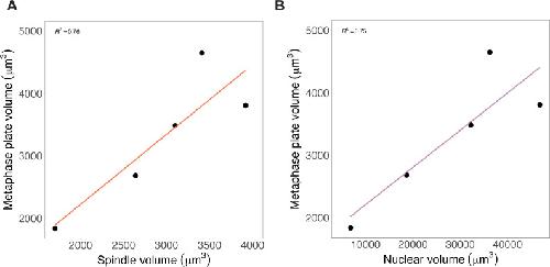 Figure 1—figure supplement 4 Metaphase plates scale similarly with both nuclei and spindles. (A) Average total mitotic chromosome volumes plotted against (A) spindle volumes or (B) nuclear volumes, binned by cell diameter (bin 1 = 35–239 μm, bin 2 = 239–442 μm, bin 3 = 442–645 μm, bin 4 = 645–848 μm, bin 5 = 848–10,500 μm). Data are fit with a linear regression, n = 3 biological replicates. Source data are available in Figure 1—source data 1. |