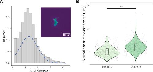 Figure 2—figure supplement 1. Chromosome width increases slightly during early embryo cleavage stages.(A) Chromosome widths were calculated by performing a line scan across the long axis of the chromosome followed by a Gaussian fit. The full width half max (FWHM) of the Gaussian curve was used to determine chromosome width. (B) Chromosome widths of stage 3 vs. stage 8 chromosomes (normalized to the median of stage 3 widths) isolated from mitotic embryo extracts, showing a 1.2-fold increase in median width from stage 3 to stage 8. n = 3 biological replicates. **p<0.001 by the Mann–Whitney U test. Source data are available as Figure 2—source data 1. |