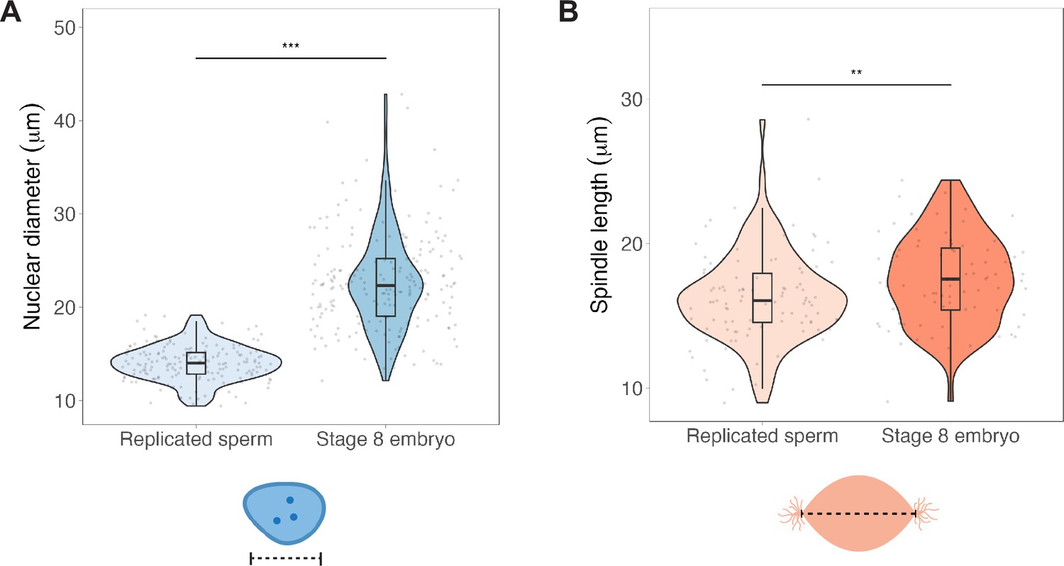 Figure 3—figure supplement 2. Nuclei and spindles do not scale with mitotic chromosome size in egg extracts.(A) Diameters of replicated sperm nuclei or stage 8 embryo nuclei measured just before addition to metaphase egg extracts. (B) Lengths of spindles formed around either replicated sperm nuclei or embryo nuclei in metaphase egg extracts. n = 3 biological replicates, >25 structures per replicate. ***p<0.001, **p=0.004 by the Mann–Whitney U test. Source data are available in Figure 3—source data 1. |