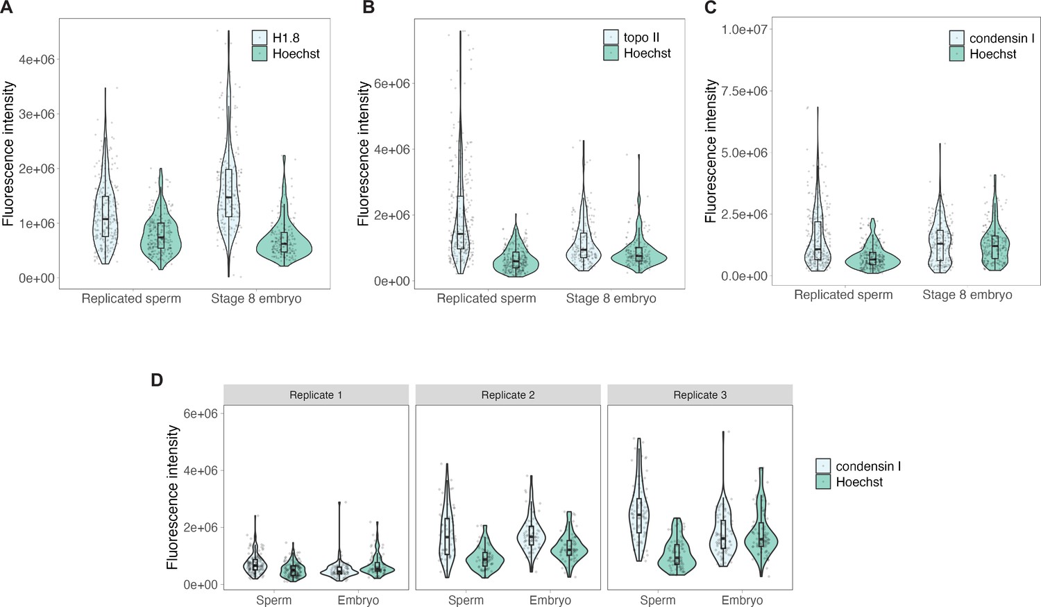 Figure 3—figure supplement 3. Raw fluorescence intensities for embryo vs. sperm immunofluorescence.(A–C) Background-subtracted fluorescence intensities for data presented in Figure 3D, with protein of interest and Hoechst signals plotted separately. n = 3 biological replicates, >50 chromosomes per replicate. (D) Raw intensities for three biological replicates of condensin I immunofluorescence experiment. Source data are available in Figure 3—source data 1. |