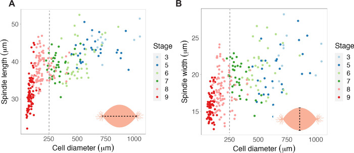 Figure 1—figure supplement 2 Scaling of spindle length vs. width to cell size. (A) Spindle lengths and (B) widths plotted against cell diameter. Gray dotted lines are placed at ~250 μm to help visualize the inflection point reached in spindle length scaling, but not in spindle width scaling. n = 3 biological replicates. Source data are available in Figure 1—source data 1. |
