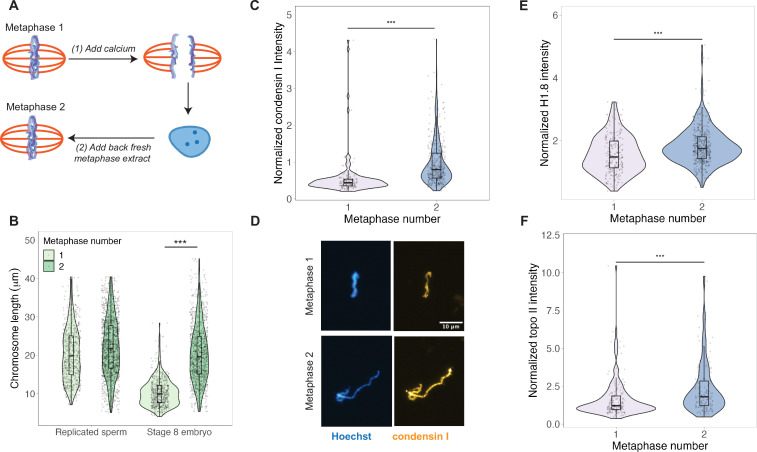 Figure 3—figure supplement 5 Scaling factors are reloaded onto embryo chromosomes after an additional interphase in egg extracts. (A) Schematic of anaphase experiment. Calcium is added to send metaphase spindles containing embryo chromosomes into anaphase, and then interphase. After nuclei were formed, fresh metaphase extract was added to trigger a second round of mitotic chromosome formation. (B) Chromosome lengths for the first and second metaphase, for both replicated sperm and stage 8 embryo mitotic chromosomes. (C) Abundance of condensin I (xCAP-G) on stage 8 embryo chromosomes in the first or second metaphase. (D) Representative images of embryo chromosomes from metaphase 1 or metaphase 2, stained for condensin I. (E, F) Abundance of histone H1.8 and topo II on stage 8 embryo chromosomes in the first or second metaphase. Based on median values, condensin I increased 2-fold, histone H1.8 increased 1.2-fold, and topo II increased 1.5-fold from the first to second metaphase. n = 3 biological replicates, >50 chromosomes per replicate. ***p<0.001 by the Mann–Whitney U test. Source data are available in Figure 3—source data 1. |
