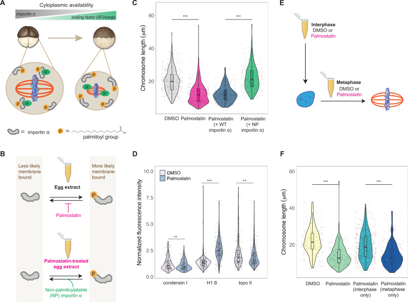 Figure 6 with 1 supplement Importin α partitioning scales mitotic chromosomes to spindle and cell size. (A) Model for how importin α scales mitotic spindles to cell size (Brownlee and Heald, 2019). Due to palmitoylation of importin α, a portion of it is driven to the cell membrane, where it can no longer interact with nuclear localization sequence (NLS)-containing scaling factors, freeing them to shrink the mitotic spindle. As cell surface area/volume (SA/V) increases during embryogenesis, proportionally more importin α is driven to the membrane, thus increasing the cytoplasmic availability of scaling factors. (B) Top: inhibition of the major depalmitoylation enzyme APT1 by adding the drug palmostatin to egg extracts mimics smaller cells by increasing the proportion of palmitoylated, membrane-bound importin α. Bottom: addition of non-palmitoylatable (NP) importin α should rescue chromosome size in palmostatin-treated egg extracts by increasing the proportion of cytoplasmic importin α. (C) Quantification of mitotic chromosome lengths in palmostatin-treated extracts and rescue of chromosome length by addition of non-palmitoylatable (NP) importin α but not by wild-type (WT) importin α. (D) Quantification of condensin I, histone H1.8, and topo II abundance of mitotic chromosomes formed in DMSO or palmostatin-treated extracts. (E) Schematic of experiment to test whether importin α partitioning plays a role in chromosome scaling during interphase or metaphase. (F) Quantification of chromosome lengths for experiment described in (E). n = 3 biological replicates, >50 chromosomes per replicate. ***p<0.001 and ** <0.01 by the Mann–Whitney U test. Source data are available in Figure 6—source data 1. |