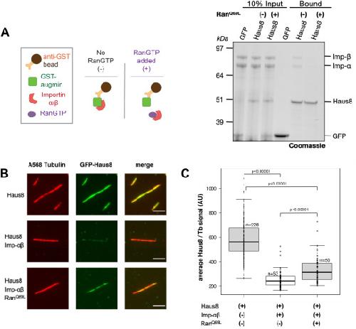 Figure 4. RanGTP releases importin inhibition of MT binding.A, GFP or GFP-Haus81–150 was bound to α-GFP magnetic resin and incubated with importin-αβ in the presence or the absence of a 10-fold excess of RanQ69L. Both importin-αβ binding and augmin loading were assessed by Coomassie staining and the intensity of bands at the indicated sizes. B, in vitro localization of GST-GFP-Haus81–150 binding to GMPCPP-stabilized MT seeds, as visualized by TIRF microscopy (top row). Addition of importin-αβ heterodimer inhibits binding of Haus8 to MTs (middle row), whereas addition of RanQ69L rescues MT binding of Haus8 (bottom row). Images belonging to the same experiment were contrast matched. To compare Haus8 fluorescence intensity across experiments, the intensity was normalized with respect to the tubulin signal. This is quantified in C. C, boxplot of average GFP-Haus8 signal relative to the average tubulin signal, where each marker represents a single MT from the experiment shown in F. n corresponds to the total number of MTs. Center lines show the medians; box limits indicate the 25th and 75th percentiles as determined by R software; whiskers extend 1.5 times the interquartile range from the 25th and 75th percentiles. p Values were calculated from independent t tests. Scale bars correspond to 5 μm. GST, glutathione-S-transferase; MT, microtubule; TIRF, total internal reflection fluorescence. |