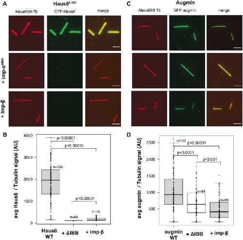 Figure 3. Importins regulate augmin binding to MTs.A, WT GST-GFP-Haus8 localizes strongly to GMPCPP-stabilized MT seeds in vitro (top row), as visualized by TIRF microscopy. In the presence of importin-αΔIBB (middle row) or importin-β (bottom row), binding of Haus8 to MTs is diminished. This is quantified in B. B, boxplot of average GFP-Haus8 signal relative to the average tubulin signal, where each marker represents a single MT from the experiment shown in F. The total number of MTs (n) was collected from two replicates. The boxes extend from the 25th to 75th percentile, and the upper and lower bars represent the minimum and maximum, respectively. p Values were calculated from independent t tests. C, WT GFP-labeled augmin localized to GMPCPP-stabilized MT seeds in vitro (top row), as visualized by TIRF microscopy. In the presence of importin-αΔIBB (middle row) or importin-β (bottom row), binding of augmin to MTs is decreased but not eliminated. This is quantified in D. D, boxplot of average GFP-augmin signal relative to the average tubulin signal, where each marker represents a single MT from the experiment shown in F. The total number of MTs (n) was collected from two replicates using two independent augmin preparations. Center lines show the medians; box limits indicate the 25th and 75th percentiles as determined by R software; whiskers extend 1.5 times the interquartile range from the 25th and 75th percentiles. p Values were calculated from independent t tests. In A and C, images belonging to the same experiment were contrast matched. To compare Haus8 fluorescence intensity across experiments, the intensity was normalized with respect to the tubulin signal. Scale bars correspond to 5 μm. GST, glutathione-S-transferase; IBB, importin-β binding; MT, microtubule; TIRF, total internal reflection fluorescence. |
