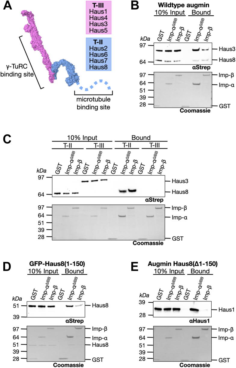 Figure 1. Augmin binds to importins. A, structure of the augmin complex, broken into the γ-TuRC binding T-III (pink), comprised of subunits Haus1 and Haus3–5, and the MT-binding T-II (blue), comprised of subunits Haus2 and Haus6–8. The disordered N terminus of Haus8 (shown as a dashed blue line) contains the primary MT-binding site. Structure of Xenopus augmin was taken from Ref. (39). B, glutathione beads bound to either GST (control), GST-importin-αΔIBB, or GST-importin-β were incubated with full-length augmin, then both the input and bound fraction were Western blotted for intact augmin complexes using an antibody against the Strep-tagged subunits Haus3 (T-III) and Haus8 (T-II). Below, GST and GST-importin loading was demonstrated by Coomassie stain. C, as in (B), importin-bound beads were incubated with augmin, either T-III or T-II, and binding of intact augmin subcomplex was detected via Western blot against the Strep-tagged subunits Haus3 and Haus8. D, Haus81–150 (fused to an N-terminal Strep-tagged GFP) was incubated with importin-bound beads, and binding was detected via Western blot. E, augmin complex lacking the N-terminal 150 residues of Haus8 was incubated with importin-bound beads, and binding of intact augmin complex was detected via Western blot against augmin subunit Haus1. γ-TuRC, γ-tubulin ring complex; GST, glutathione-S-transferase; IBB, importin-β binding; MT, microtubule; T-III, tetramer III. |
