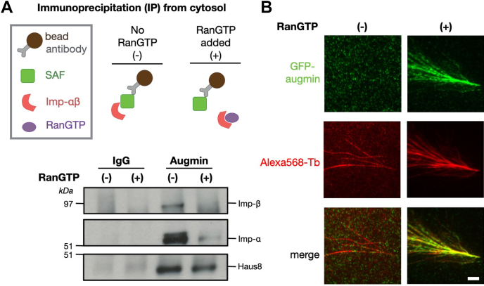 Figure 5. Ran regulates augmin in Xenopus egg extract. A (top), schematic of immunoprecipitation (IP) strategy where antibodies were conjugated to magnetic beads (top). Bottom, Western blot of IPs for a control antibody (immunoglobulin [IgG]) and antiaugmin in the presence or the absence of RanQ69L. B, TIRF images of augmin in Xenopus egg extract in the absence (left column) and presence (right column) of RanQ69L. Branching MT nucleation reactions were carried out with Alexa568-labeled tubulin and fixed after 15 min. Endogenous augmin was detected via indirect immunofluorescence with custom primary antibodies against Haus8 and Alexa488-conjugated secondary antibodies. Scale bar corresponds to 5 μm. MT, microtubule; TIRF, total internal reflection fluorescence. |