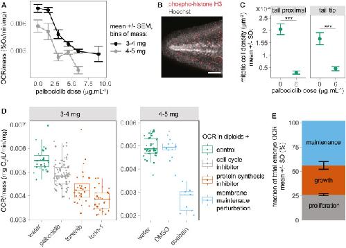 Figure 3. An embryo energy budget establishes the costs of proliferation, biosynthesis, and maintenance (A) OCR per mass as a function of palbociclib doses for stage 41 diploid embryos and two bins of mass (6 clutches, n = 2–57 per bin of mass and palbociclib concentration). (B) Representative image of phospho-histone H3 immunostaining and Hoescht DNA dye staining of tadpole tails (scale bar, 200 μm). (C) Mitotic cell density in the tails of stage 41 diploid embryos assessed by quantifying phospho-histone H3-positive cells (n = 2, 5–6 embryos per clutch, Welch two-sample t test comparing the means, ∗∗∗p < 0.001). (D) OCR per mass for stage 41 diploid embryos in water, 6 μg/mL palbociclib, 12.5 nmol/mL torkinib, 1 μg/mL torin-1, 0.1% DMSO, or 200 μg/mL ouabain. (E) The percentage decrease of OCR in diploids upon treatment with drugs in (D) provides an estimate of the contribution of proliferation (palbociclib), growth (torkinib, torin-1), and maintenance (ouabain) to the overall embryo energy expenditure. See also Figures S3 and S4. |