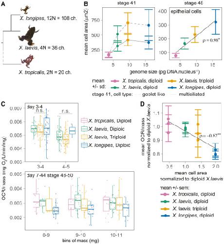 Polyploidy in Xenopus lowers metabolic rate by decreasing total cell surface area.