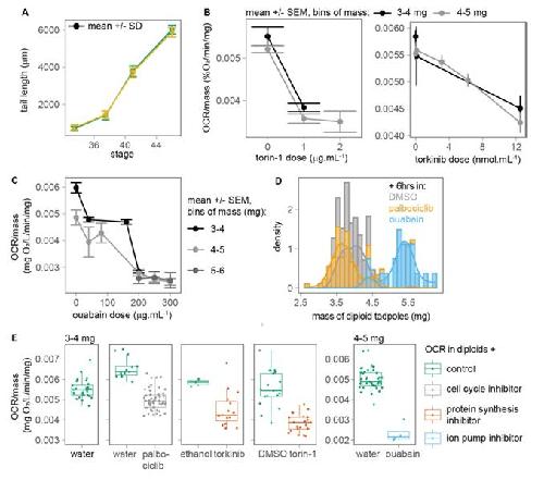 Figure S3. Controls for the drug treatments used to establish the embryo energy budget at stage 41. Related to Figure 3. (A)Tail length throughout development (2-4 clutches per stage, n > 30 embryos per ploidy and stage). (B) OCR per mass as a function of torin-1 (left) and torkinib (right) doses for stage 41 diploid embryos and two bins of mass. Torkinib doses higher than 12.5 nmol/mL induced significant death rate and were thus removed from the analysis (torin-1: 3 clutches, n = 4-22 per bin of mass and dose; torkinib: 2 clutches, n = 2-20 per bin of mass and dose). (C) OCR per mass as a function of ouabain doses for stage 41 diploid embryos and three bins of mass (6 clutches, n = 5-26 tadpoles per bin of mass and dose). (D) The 6-hr treatment with ouabain induced a significant increase in embryo body mass compared with embryos treated with palbociclib or DMSO. This is likely because of perturbations of intracellular osmolarity following inhibition of the Na+/K+ ATPase. (E) Details of results from Figure 3D showing OCR/mass in diploids for each pairof control (drug solvent) and drug treatment. Palbociclib and ouabain were solvated in water, torkinib in ethanol (final ethanol concentration at 0.025%), and torin-1 in DMSO (final DMSO concentration at 0.1%). The solvents did not affect the average OCR/mass value compared with embryos in water. Palbociclib experiments displayed a slightly higher control value (see Figure S4A). |