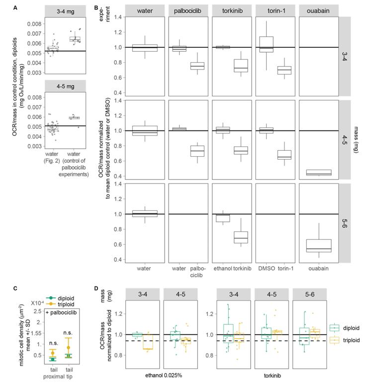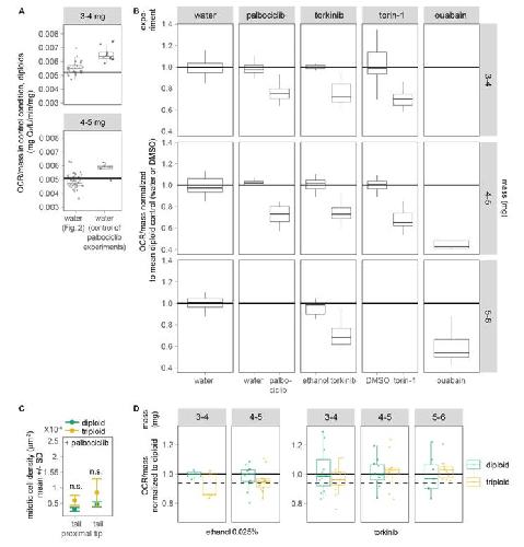 Figure S4. Normalization strategy for calculating the embryo energy budget and controls for drug treatments. Related to Figures 3 and 4. (A) The average OCR measured in diploids was higher in untreated controls (in water) for the set of experiments performed in the palbociclib assay (Figure 3A and D) compared with previous measurements in water (Figure 2C). This may be due to a transient problem in calibration of the SDR device since later experiments in water, ethanol, or DMSO (Figure 3D and S3E) showed that diploids were again at the initially measured value. (B) To account for this control OCR variability and to calculate the OCR decrease with drug treatments in Figure 3E, we first normalized each drug-treated condition to the mean diploid untreated value for that experiment. (C) Mitotic cell density in tails after 6 hr treatment with or without 6 µg/mL palbociclib (2 clutches, 5-6 embryos per clutch and condition; Welch t-test comparing the mean, *: p<0.05, **: p<0.01, n.s.: not significant). (D) Experiments with torkinib (right) and solvent control (left) showing that 0.025% ethanol does not impact the OCR decrease in stage 41 triploids compared to diploids. |