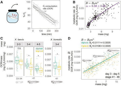 Figure 2. Metabolism assessed by single-tadpole oxygen consumption rates varies between diploids and triploids of both X. laevis and X. borealis (A) Single tadpoles were placed in individual glass vials sealed from air. The decrease in O2 levels over time was used to calculate the oxygen consumption rate (OCR) for each tadpole. (B) OCR as a function of body mass in diploid X. laevis embryos from day 2 to 5 pf. The curve shows a fit with values and (n = 271) (see STAR Methods and Table S2). (C) OCR for bins of body mass and stages in X. laevis (left) and X. borealis (right) of diploid and triploid embryos (t test comparing the means, ∗p < 0.5, ∗∗p < 0.01; 3–5 clutches per condition; details in Table S3). (D) OCR as a function of body mass in diploid (n = 189) and triploid (n = 165) tadpoles from day 3 (stage 41) to day 5 (stage 46). The lines represent linear fits of the logarithmic values, which yielded the same allometric scaling component exponent α ( ), but different Y-intercepts that indicate a lower basal metabolic rate (B0) in triploids (see STAR Methods and Table S2). See also Figure S2. |