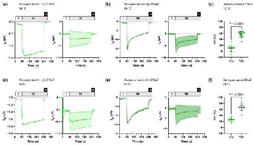 Figure 2. Sodium self-inhibition (SSI) of Xenopus laevis αβγ- or δβγ-ENaCs heterologously expressed in Xenopus oocytes. (a) Left panel: representative transmembrane (IM) recording of an oocyte expressing αβγ-ENaC at 19 °C; right panel: mean ± SD plotted from experiments as shown in the left panel (n = 11). (b) Left panel: representative transmembrane (IM) recording of an oocyte expressing δβγ-ENaC at 19 °C; right panel: mean ± SD plotted from experiments as shown in the left panel (n = 19). (c) SSI was calculated as the percent decrease in amiloride-baseline subtracted IM within 3 min after switching the extracellular solution from low-sodium (1) to high-sodium (90) ORS. For αβγ-ENaC, n = 11; for δβγ-ENaC, n = 19. Student’s unpaired t-test (two-tailed). (d,e) Similar to panels (a,b) with recordings performed at 24 °C, for αβγ-ENaC, n = 8; for δβγ-ENaC, n = 9. (f) Similar to panel (c) with data from recordings performed at 24 °C, for αβγ-ENaC, n = 8; for δβγ-ENaC, n = 9. Student’s unpaired t-test (two-tailed). Notes: 1 = low-sodium ORS containing 1 mM NaCl; 90 = high-sodium ORS containing 90 mM NaCl; a = amiloride.
