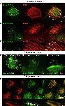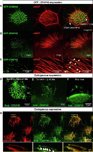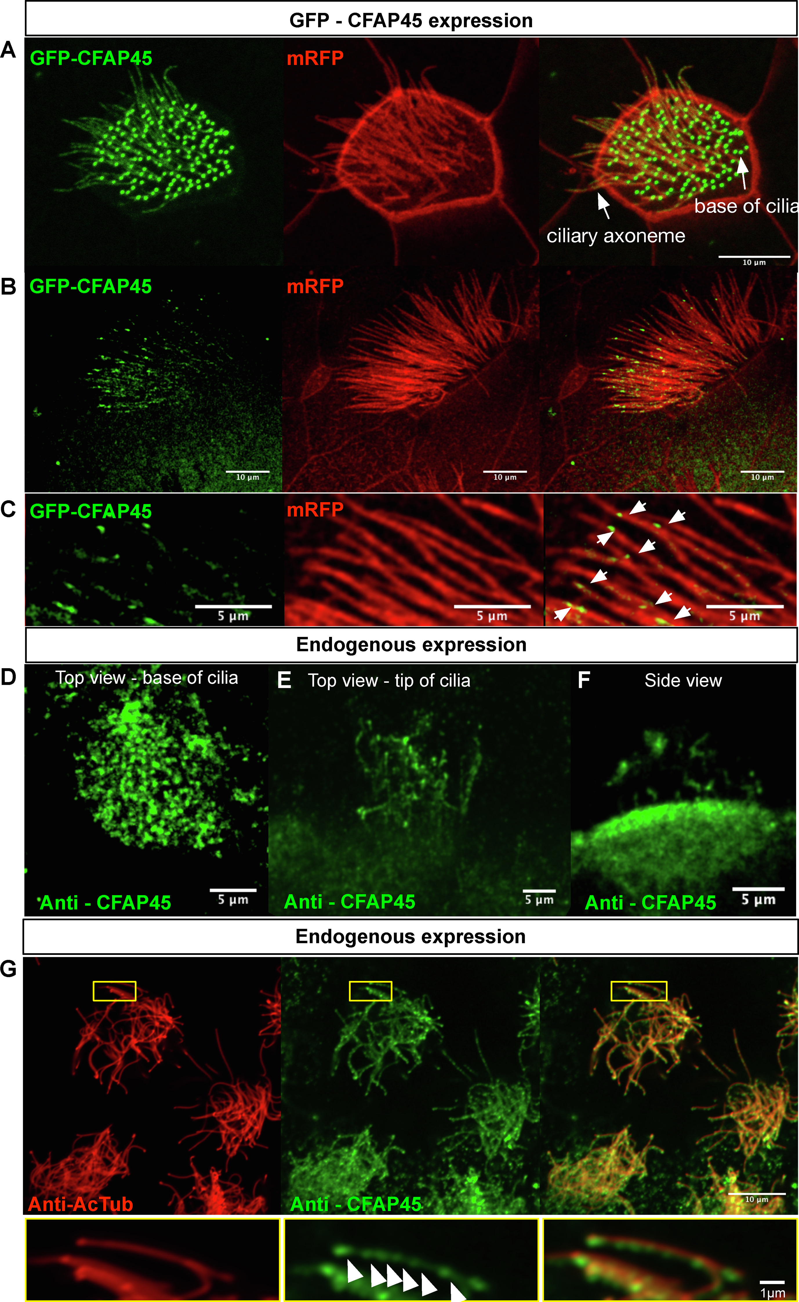 Fig. 6. Cfap45 localization in X.tropicalis MCCs (AC) X. tropicalis epidermis expressing GFP-CFAP45 and membrane RFP. (A) Focus is concentrated on the base of the cilia where GFP-CFAP45 is expressed, (B) Focus is concentrated on the cilia showing the dotty localization along the axonemes. (C) Magnified views. White arrows highlight GFP-CFAP45 localization. (DF) X. tropicalis epidermal MCCs labeled with anti-CFAP45. (D) Top view focusing on the base of the cilia at the apical surface. (E) Top view focusing on the cilia axonemes. (F) Side view showing apical surface and cilia staining. (G) X. tropicalis epidermal MCCs labeled with anti-acetylated -tubulin (red, cilia) and anti-CFAP45 (green). Anti-CFAP45 staining pattern is identical to the GFP-CFAP45 expression, showing CFAP45 localization to the cilia in a dotty fashion in the magnified views along the bottom (white arrows). |