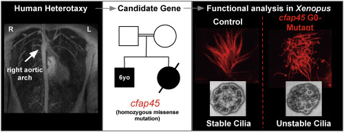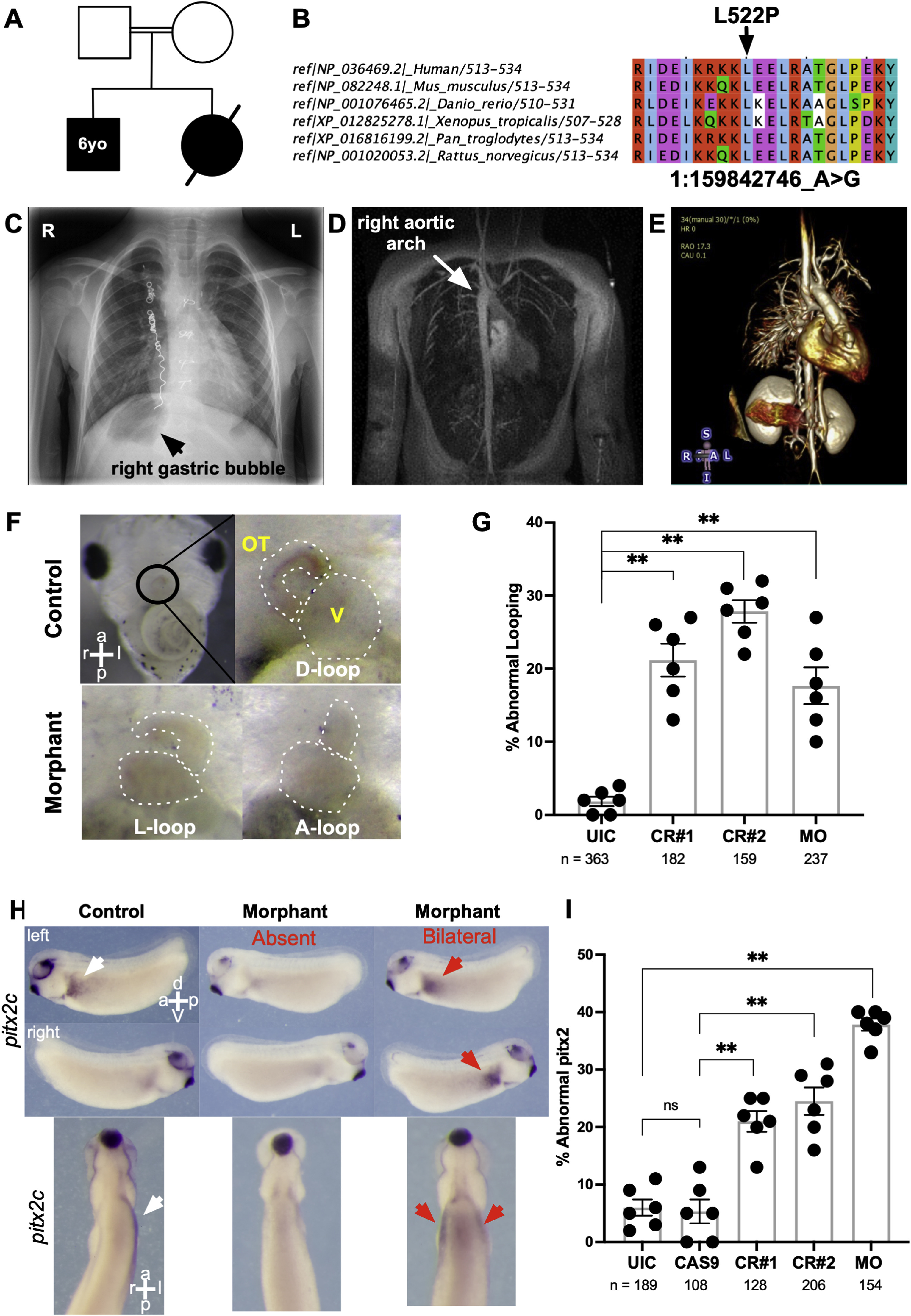 Fig. 1. cfap45 loss-of-function in humans and Xenopus leads to heterotaxy phenotype (A) Family pedigree showing the affected 6yo patient and the similarly affected sibling who died at 25 days of life. (B) Multiple alignments around the patient variant L522P demonstrate a remarkable degree of conservation of amino acids. (C) Chest X-ray shows the right gastric bubble. (D) CT-scan of the chest and (E) 3D reconstruction shows the right aortic arch indicating abnormal left-right patterning (F) The first row shows the tadpole heart in uninjected control (D-loop), and the second row shows the morphant with abnormal (L and A-loop) looping states at stage 46 Xenopus heart. The cardiac sac is magnified, the outflow tract border and the ventricle are outlined in white. OT: outflow tract; Ventricle. (G) The graph represents abnormal looping percentages in G0 mutants (Crispr#1, Crispr#2) and morphants. Each point represents one experimental group. (H) cfap45 knockdown leads to pitx2c abnormalities. The first column shows normal pitx2c expression in the left lateral mesoderm and is absent on the right of stage 2831 Xenopus embryos, highlighted with a white arrow. The second and third columns show abnormal pitx2c expression as absent or bilateral, highlighted with red arrows following MO mediated cfap45 depletion. (I) The graph represents abnormal pitx2c expression percentages in G0 mutants (Crispr#1, Crispr#2) and morphants. Each point represents one experimental group. D: dextro, L: levo, A: ambiguous. p < 0.05, p < 0.01, p < 0.001, p < 0.0001. |