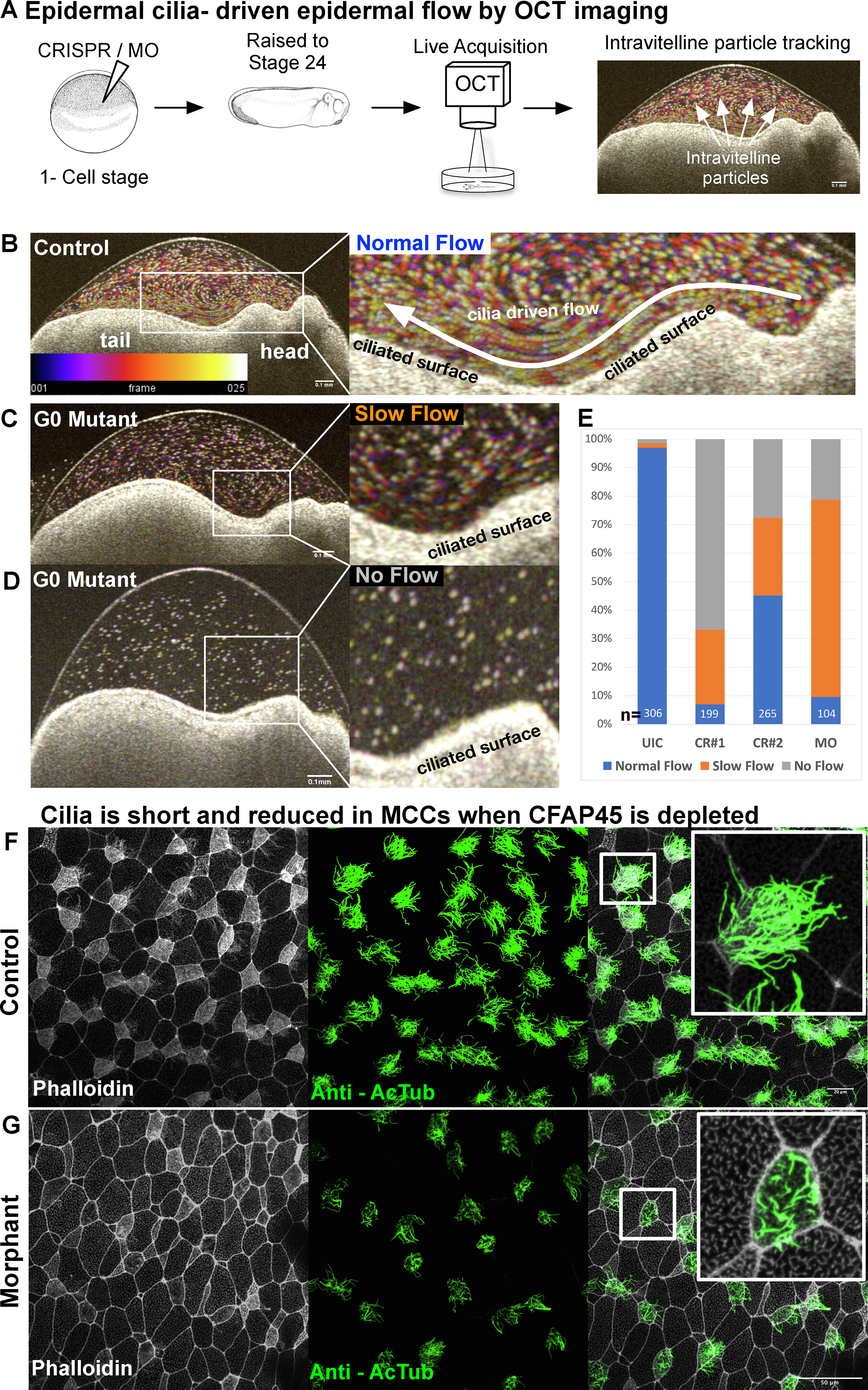 Fig. 3. cfap45 knockdown causes abnormalities in cilia-driven epidermal flow and leads to defects in epidermal multicilia. (A) Epidermal multicilia beating is planarly polarized, generating head-to-tail fluid flow along the surface. This flow can be visualized using Optical Coherence Tomography (OCT) imaging, where intravitelline endogenous particle movements can be tracked in vivo (Movie1). (BE) We obtained real-time OCT movies and, using 25 frames, built particle trajectories with ImageJ. Temporal color coding depicts particle trajectory over time. The color bar represents color versus the corresponding frame number in the color-coded image. Based on the trajectory map over 25 frames, we classified the flow as normal (B), slow (C), or absent (D). When cfap45 is depleted, the epidermal flow is significantly slower or stationary. (E) Based on OCT imaging, percentages of embryos with normal, slow, and no-flow in uninjected controls and cfap45 depleted tadpolesn = number of embryos. (FG) Cilia are lost in multiciliated cells (MCCs) when Cfap45 is depleted with MO. Epidermal MCCs marked with anti-acetylated-tubulin (green) for cilia and phalloidin (white) for actin. |