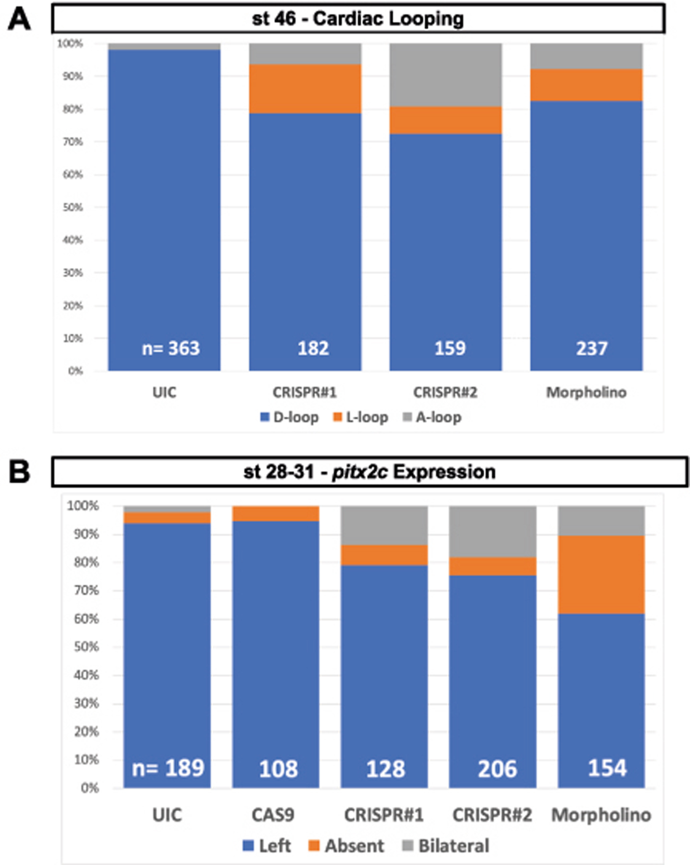 Supplemental Fig. 1. Graphs showing percentages of different abnormal phenotypes for (A) cardiac looping and (B) pitx2c expression. |