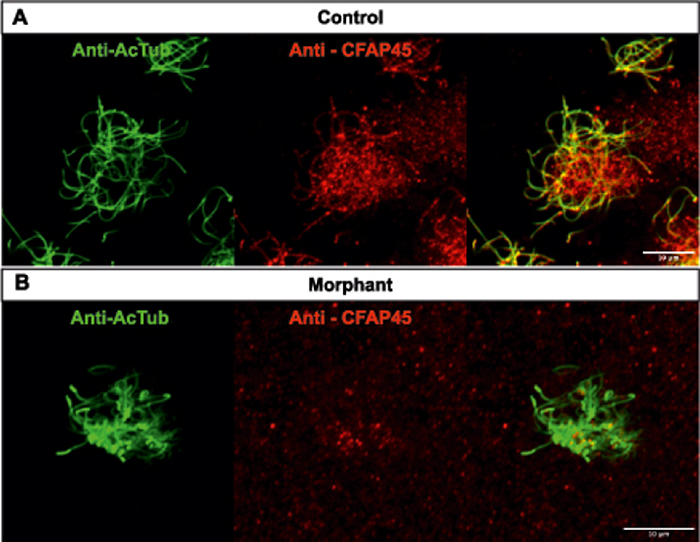 Supplemental Fig. 4. X. tropicalis epidermal MCC labeled with anti-acetylated -tubulin (green, cilia) and anti-CFAP45 (red). (A) Anti-CFAP45 staining showing CFAP45 localization to the cilia in a dotty fashion. (B) Depletion of CFAP45 by MO results in loss of anti-CFAP45 signal and deformed MCC. |