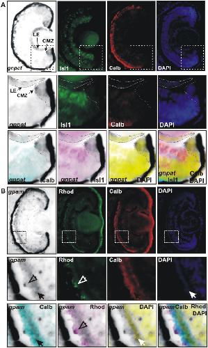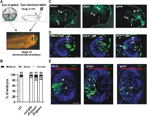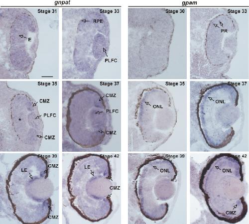 PURPOSE: Plasmalogens (Plgs) are highly abundant lipids in the retina, and their deficiency leads to severe abnormalities during eye development. The first acylation step in the synthesis of Plgs is catalyzed by the enzyme glyceronephosphate O-acyltransferase (GNPAT), which is also known as dihydroxyacetone phosphate-acyltransferase (EC 2.3.1.42). GNPAT deficiency produces rhizomelic chondrodysplasia punctata type 2, a genetic disorder associated with developmental ocular defects. Despite the relevance of retinal Plgs, our knowledge of the mechanisms that regulate their synthesis, and the role of GNPAT during eye development is limited. METHODS: Using the Xenopus laevis model organism, we characterized by in situ hybridization the expression pattern of gnpat and compared it to glycerol 3-phosphate acyltransferase mitochondrial (gpam or gpat1) during eye neurogenesis, lamination, and morphogenesis. The Xenopus Gnpat was biochemically characterized in a heterologous expression system in yeast. RESULTS: During development, gnpat is expressed in proliferative cells of the retina and lens, and post-embryogenesis in proliferative cells of the ciliary marginal zone and lens epithelium. In contrast, gpam expression is mainly restricted to photoreceptors. Xenopus Gnpat expressed in yeast is present in both soluble and membrane fractions, but only the membrane-bound enzyme displays activity. The amino terminal of Gnpat, conserved in humans, shows lipid binding capacity that is enhanced by phosphatidic acid. CONCLUSIONS: Enzymes involved in the Plgs and glycerophospholipid biosynthetic pathways are differentially expressed during eye morphogenesis. The gnpat expression pattern and the molecular determinants regulating Gnpat activity advance our knowledge of this enzyme, contributing to our understanding of the retinal pathophysiology associated with GNPAT deficiency.