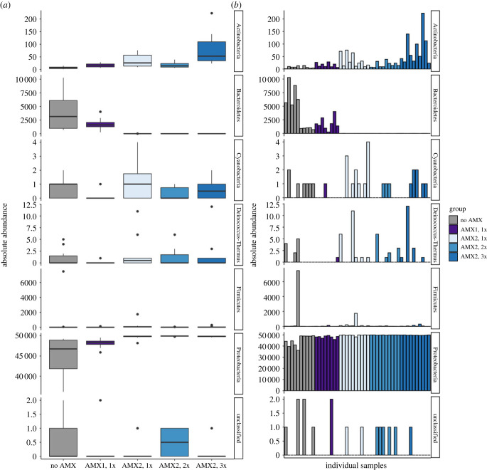 Figure 2. . Non-metric multidimensional scaling (NMDS) ordination of groups of tadpoles treated with antimicrobial cocktail or sham control solutions and reared in sterile and non-sterile conditions. (a) Groups of tadpoles after antimicrobial (AMX; purple points and ellipse) or sham control treatments (no AMX; grey points and ellipse) and reared with sterile food (darker shade of purple and grey points) or non-sterile food (lighter shades of purple and grey points). (b) NMDS ordination of treatment groups of tadpoles after a single treatment of antimicrobial 1 (AMX1; purple points and ellipse) or sham control treatments (no AMX; grey points and ellipse) or antimicrobial 2 (AMX2; blue points and ellipses) that were administered once (light blue points), twice (medium blue points) or three times (dark blue points).