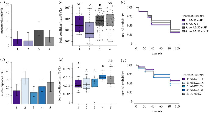Figure 4. . Development, body condition and survival in groups of Xenopus laevis treated with antimicrobial cocktail or sham control solutions and reared in sterile and non-sterile conditions. (a,d) Percentage of froglets (total number of frogs/initial number of embryos; not including tadpoles used for 16 s sequencing) of Xenopus laevis that successfully completed metamorphosis (% with 95% Clopper–Pearson confidence intervals). (b,e) Body condition of tadpoles taken five weeks after embryo arrival (calculated as mass/snout-to-vent length). (c,f) Survivorship of X. laevis tadpoles during development. Box and whisker plots show median values with upper and lower quartiles and maximum and minimum values.