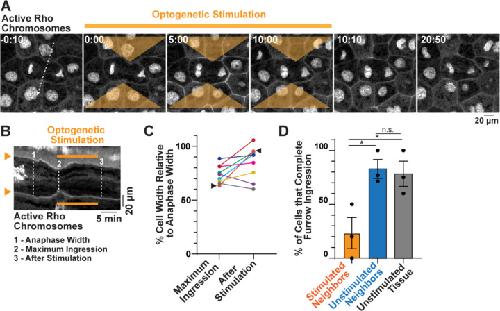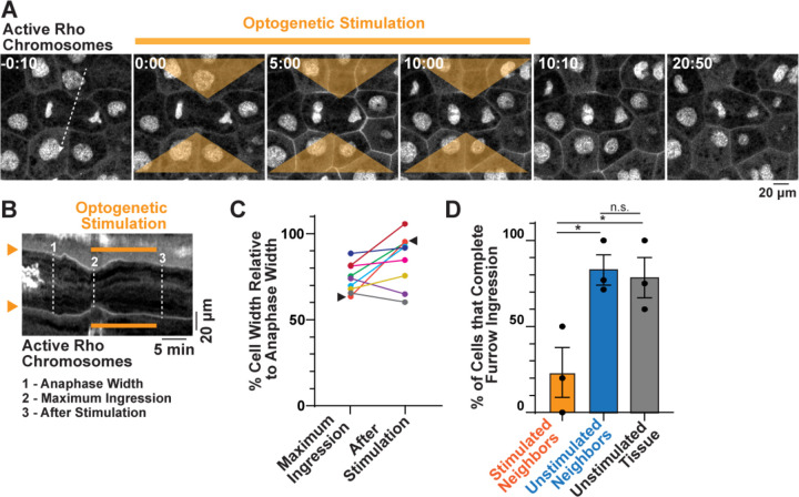 Figure 4:. Optogenetic activation of contractility in both neighbors causes cytokinetic failure.A) Micrographs from time-lapse confocal imaging of cytokinesis with optogenetic stimulation of Rho-mediated actomyosin contractility in neighbors on both sides of the furrow. Orange triangles and orange line indicate the regions and duration of stimulation, respectively. Time shown in minutes:seconds. B) Kymograph of furrow ingression generated from the dashed line shown in (A). Orange arrowheads indicate both sides of the furrow with a stimulated neighbor. Orange line indicates the duration of stimulation. Dashed lines indicate example time points used to measure cell width at Anaphase (1), Maximum Ingression (2), and After Stimulation (3). C) Quantification of cell width at the equator relative to the initial anaphase width. Arrowheads indicate the maximum ingression width and width after stimulation for the cell shown in (B). D) Quantification of the success of cytokinesis for dividing cells with stimulated neighbors, dividing cells in the same field of view with unstimulated neighbors, and cells expressing the optogenetic system but dividing in tissue that did not experience light stimulation. Mean ± SEM. For stimulated neighbors: n = 12 cells, 12 embryos, for unstimulated neighbors: n = 28 cells, 10 embryos, and for unstimulated tissue: n = 26 cells, 8 embryos, * p ≤ 0.05.