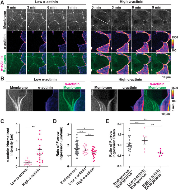 Figure 2:. Overexpression of ɑ-actinin in neighbor cells slows cytokinetic furrow ingression.A) Micrographs from time-lapse confocal imaging of cytokinesis with neighbors overexpressing low or high levels of GFP-ɑ-actinin and stained with a membrane dye (CellMask Deep Red). B) Kymographs of membrane and ɑ-actinin signal during furrowing generated from the dashed lines shown in (A). C) Quantification of ɑ-actinin signal intensity normalized to membrane in neighbor cells used in the analysis of rate of furrow ingression. Mean ± SEM. For low overexpression: n = 14 cells, 5 embryos. For high overexpression: n = 18 cells, 7 embryos. ** p ≤ 0.005. D) Quantification of the rate of furrow ingression for junctions with neighbors expressing endogenous, low overexpression, or high overexpression of ɑ-actinin. Mean ± SEM. For junctions with endogenous neighbors: n = 50, 32, 19 (junctions, dividing cells, embryos), for low overexpression: n = 16, 11, 5, for high overexpression: n = 23, 17, 8. * p ≤ 0.05 and ** p ≤ 0.005. E) Ratio of furrow ingression rate for cells with two neighbors with endogenous levels of ɑ-actinin, one endogenous and one low overexpression neighbor, and one endogenous and one high overexpression neighbor. Mean ± SEM. For two endogenous neighbors: n = 19 cells, 10 embryos, for one low overexpression/one endogenous neighbor: n = 6 cells, 3 embryos, for one high overexpression/one endogenous neighbor: n = 7 cells, 6 embryos. ** p ≤ 0.005.