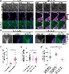 Figure 3:. Optogenetic activation of contractility in one neighbor cells stalls furrowing.A) Micrographs from time-lapse confocal imaging of cytokinesis with optogenetic stimulation of Rho-mediated actomyosin contractility in neighbors on one side of the furrow. Orange triangle and orange line indicate the region and duration of stimulation, respectively. Time shown in minutes:seconds. B) Kymograph of furrow ingression generated from the dashed line shown in (A). Orange arrowhead indicates side of furrow with a stimulated neighbor, blue arrowhead indicates side of furrow with unstimulated neighbor. Orange line indicates the duration of stimulation. C) Quantification of the rate of furrow ingression before, during, and after neighbor cells were optogenetically stimulated. Junctions neighboring the stimulated cells are shown in warm colors, while corresponding junctions with unstimulated neighbors are shown in cool colors. Mean ± SEM. n = 7 junctions, 7 cells, 5 embryos. * p ≤ 0.05 and ** p ≤ 0.005. D) Total rate of furrow ingression for junctions from cells with stimulated (orange) or unstimulated (blue) neighbors, as shown in (C), or for junctions in control cells selected from a region in the field of view that was well separated from the region of optogenetic stimulation. Mean ± SEM. For stimulated and unstimulated junctions: n = 7 junctions, 7 cells, 5 embryos, for control cells: n = 20 junctions, 10 cells, 6 embryos. * p ≤ 0.05 and ** p ≤ 0.005.