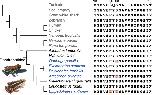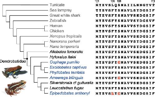 Fig. 1. Phylogeny of selected chordates showing the variation of amino acid sequences in the region of interest of the β2 nAChR subunit. Scientific names are used for the frogs. The dot in the phylogeny represents the ancestor of the poison frogs (Dendrobatidae clade). The names of undefended species of poison frogs are in black, and those of defended species are in blue. Defense by sequestered alkaloids appears to have evolved three times, associated with the parallel evolution of S108C and the unique evolution of F106L in Epipedobates. Accession numbers and names of the species included in this figure can be found in Additional file 3. Photos of Ameerega bilinguis and Epipedobates anthonyi (from which epibatidine was first isolated) are shown in the lower left. Photos courtesy of David Cannatella