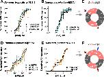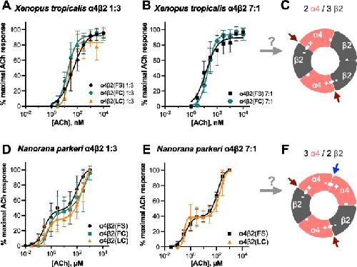 Fig. 2. Acetylcholine CRCs of receptors from two non-dendrobatid frogs. Xenopus tropicalis retain a monophasic ACh CRC best fit with a single EC50 (Table 1 and Additional file 4) even in conditions that induce LS sites in mammalian α4β2 nAChRs (7α:1β) or with the S108C substitution alone [β2(FC)] or in combination with F106L [β2(LC)]. The α:β RNA ratios are 1:3 (A, n = 6–18) and 7:1 (B, n = 13–37). The actual stoichiometry of frog receptors is unknown but the Xenopus α4β2 nAChR behaves as the mammalian 2α:3β stoichiometry (C). This conjecture is indicated as a question mark over the gray arrow. Note that the scale for Xenopus is nanomolar concentration. Nanorana parkeri retain a biphasic CRC best fit with two EC50 values (Table 2 and Additional file 4) in both 1:3 (D, n = 5–9) or 7:1 (E, n = 6–9) α:β RNA ratios, with the S108C substitution alone [β2(FC)] or in combination with F106L [β2(LC)]. The Nanorana α4β2 nAChR behaves as if its stoichiometry is 3α:2β (F) with both ratios of RNA used in this study. Data points represent means ± SD. Red arrows indicate HS-binding sites, and blue arrow indicates LS-binding site. + and − signs indicate the principal and complementary components of the subunit interfaces