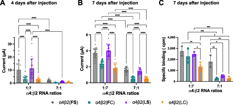 Fig. 3. Maximal ACh-induced current and labeling of Epipedobates anthonyi α4β2 nAChRs. Maximal ACh-induced currents were measured at 4 (A, n = 14–18 oocytes) and at 7 (B, n = 21) days after injection. The presence of cysteine in location 108, either combined with F106 [β2(FC), green] or with L106 [β2(LC), wild type, orange], decreases the magnitude of ACh-stimulated maximal currents through the α4β2 receptors, compared with β2(FS) (gray) and β2(LS) (violet). The bold font indicates a substitution introduced in the wild-type receptor. Following recordings shown in B, oocytes were treated with the radiolabeled antibody.125I-mAb 295 to quantify the specific binding, i.e., the number of β2-containing nAChRs expressed in the plasma membrane (C, n = 3, 7 pooled oocytes each experiment). Cpm stands for counts per minute. α4:β2 RNA injection ratios favoring HS (1:7) and LS (7:1) stoichiometries are indicated on the X-axis. Data are presented as means ± SD and were analyzed using two-way ANOVA, followed by pairwise comparisons corrected for multiple comparisons with Holm-Šídák’s test. *P < 0.05, **P < 0.01, ***P < 0.001, ****P < 0.0001