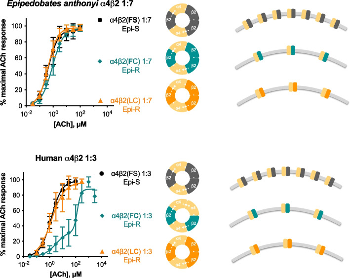 Fig. 5. Summary figure. Results from Tarvin et al. [13] are shown in the graphs on the left, from Epipedobates anthonyi (top, n = 5–9) and human (bottom, n = 6–7) nAChRs (RNA ratio 1α:7β for Epipedobates and 1α:3β for human). Epi-S and Epi-R refer to the epibatidine-sensitive and epibatidine-resistant characteristics of the receptor. These results led us to hypothesize that the mutation S108C in the human β2 subunit [α4β2(FC)] resulted in an altered stoichiometry: instead of a monophasic curve (characteristic of α4β2 nAChRs composed of 2 α4 and 3 β2 subunits), the ACh concentration–response curve for this mutant was biphasic and shifted to the right (characteristic of α4β2 nAChRs composed of 3 α4 and 2 β2 subunits. Furthermore, this alteration in the ACh sensitivity was not observed in Epipedobates receptors, which showed the same monophasic curve at all RNA ratios tested (Additional file 2). In the central panels, the predicted stoichiometry is shown as a diagram of the receptor. We now report that there is a reduction of maximal ACh-induced currents in Epipedobates receptors with C108-containing β2 subunits, likely due to reduced availability of C108-containing β2 subunits (Fig. 3). The relative number of receptors in the plasma membrane is shown on the right diagrams. No differences in ACh sensitivity were observed after biasing α4 and β2 RNA injection ratios, indicating that Epipedobates α4β2 nAChRs functionally assemble in a single stoichiometry. However, the reduced cell-surface expression of α4β2(FC) nAChRs (also observed for Epipedobates α4β2 nAChRs containing cysteine in position 108 of the β2 subunit) alters the concentration–response profile of human α4β2(FC) receptors from the monophasic (HS-like) of the wild-type nAChR to biphasic (LS-like) CRC, indicating an alternative stoichiometry. The presence of an additional mutation [β2(LC)] confers an HS-like stoichiometry but does not correct the β2-reduced availability. The studies on the human receptor numbers in the plasma membrane were obtained using concatenated receptors (Fig. 4)