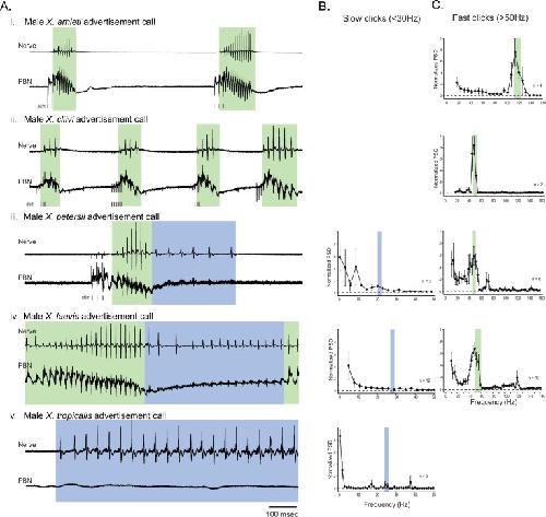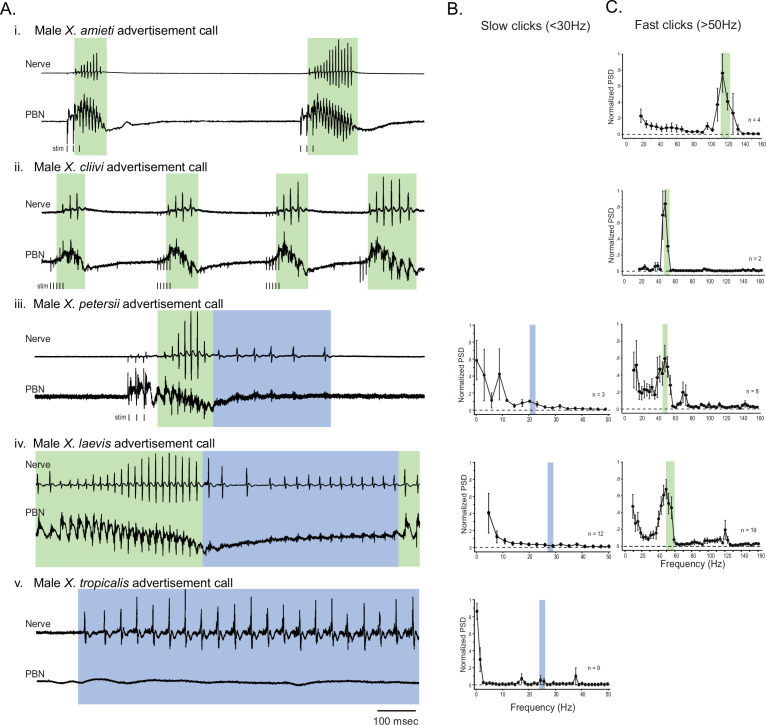 Figure 2. The activity of the parabrachial nucleus during fictive advertisement calls.(A). Local field potential (LFP) recordings obtained from the parabrachial nucleus (PBN) during fictive advertisement calling in male X. amieti (i), male X. cliivi (ii), male X. peterii (iii), male X. laevis (iv), and male X. tropicalis (v). Top traces; laryngeal nerve recording, bottom traces: PBN LFP recordings. The green and blue backgrounds indicate fast (>50 Hz) and slow (<35 Hz) compound action potentials (CAPs), respectively. Vertical lines below the traces labeled with ‘stim’ indicate the timing of electrical pulses delivered to the RLCB (Figure 1D) to elicit fictive advertisement calls in some cases. (B). mean power spectral density (PSD) of PBN LFP recordings during fictive slow clicks seen in A. Blue frames show the mean ± std of the CAP rates for slow clicks. (C). Mean PSD of PBN LFP recordings during fictive fast clicks seen in A. Green frames show the mean ± std of the CAP rates for fast clicks. |