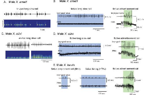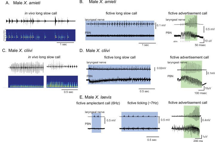 Figure 3. Calls produced by fast clickers containing slow (<35 Hz) clicks are not accompanied by salient parabrachial nucleus activity.(A, C), Amplitude envelope (top) and the sound spectrogram (bottom) of a ‘long slow call’ produced by male X. amieti (A) and male X. cliivi (C) in vivo. (B, D), Presumed fictive long slow call(left with blue background) and fictive advertisement call (right with green background) obtained from the same brain of a male X. amieti (B) and male X. cliivi (D). Top; Laryngeal motor nerve recordings, bottom; parabrachial nucleus (PBN) local field potential (LFP) recordings. The same Y scale for the PBN LFP (but with an extended X scale) is used for both fictive calls for ease of amplitude comparison. (E). A fictive amplectant call (left), fictive ticking (middle), and fictive advertisement call (right) recorded from a brain of the same male X. laevis. Top; laryngeal nerve recording, bottom; PBN LFP recording. The Y scale for the PB LFP recordings (but not the X scale) is the same for all three recordings for ease of amplitude comparison. |