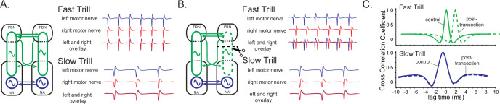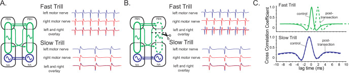 Figure 5. A model of fast trill and slow trill central pattern generators (CPGs) in male Xenopus laevis based on a previous study (Yamaguchi et al., 2017).(A). Left and right fast trill CPGs (green) span across the parabrachial nucleus (PBN) and the nucleus ambiguus (NA) whereas the slow trill CPGs (blue) are contained in the NA. The left and right CPGs coordinate their activity via reciprocal projection (shown as double-headed horizontal arrows). During fast and slow trills of a fictive advertisement call, compound action potentials (CAPs) produced by the left (blue) and right (red) laryngeal nerves are synchronous. (B). When a right PBN and right NA are transected (scissors with dotted line), the right fast trill CPGs become dysfunctional while the left fast trill CPGs and both slow trill CPGs remain functional. When a fictive advertisement call is elicited from the transected brain, the CAPs produced by the nerve on the transected side (right) were delayed compared to those produced by the nerve on the intact side (left) during fast trill, but not during slow trills. This delay is likely caused by the fact that the laryngeal motoneurons on the transected side (right) are driven by the fast trill CPGs on the intact (left) side during the fast trill. However, during slow trill, slow trill CPGs on both sides remain functional even after the transection, and therefore, there is no delay between the two nerves. (C). Cross-correlation coefficient as a function of lag time between left and right laryngeal nerve recording. In the control brain, the maximum cross-correlation coefficient is zero, and the activity of the two nerves is synchronous. The lag time of the maximum cross-correlation coefficient becomes positive during fast, but not during slow trills after the transection. |