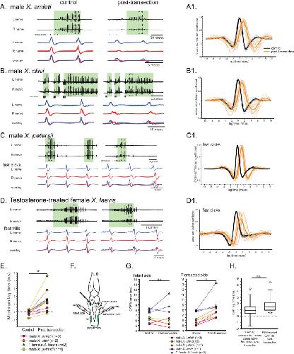 Figure 7. The unilateral transection between the parabrachial nucleus (PBN) and the nucleus ambiguus (NA) resulted in delayed compound action potentials (CAPs) during fictive fast clicks.(A – D), Fictive advertisement calls recorded from male X. amieti (A), male X. cliivi (B), male X. petersii (C), and testosterone-treated female X. laevis (D) before (left) and after (right) the unilateral transection. The top two traces are the laryngeal nerve recordings obtained from the left and right nerves. Green background indicates fictive fast clicks. Areas in dotted rectangles are enlarged in the third, fourth, and fifth traces. In these enlarged traces, the left nerve is shown in blue, the right nerve is shown in red, and both traces are overlayed at the bottom. A1 through D1 shows the cross-correlation coefficients as a function of the lag between the intact and the transected nerves during fictive advertisement calls produced by male X. amieti (A), male X. cliivi (B), fast trills of male X. petersii (C), and testosterone-treated female X. laevis (D) before (black lines) and after (orange lines) the transection. Thick lines indicate the mean and thin lines indicate individual data. (E). Mean maximum lag time for the fast clickers. After the transection, the maximum lag time significantly increased during fast clicks in the fast clickers. (F). A cartoon showing the dorsal view of the brain showing the stimulation of the intact parabrachial nucleus (PBN) before and after the transection was made between the right PBN and the right nucleus ambiguus (NA) while recordings are obtained from both nerves. (G). CAP latency, defined as the time between the stimulus onset and the time of the CAP peak, recorded from the nerve on the intact side and on the transected side before and after the transection. The latency was measured after the 15th stimulus pulse after it reached a plateau (See Figure 8E). The CAP latency on the intact side did not change, but those on the transected side increased significantly after the transection. (H). The box plot showing the increase in the CAP lag after the transection during fictive fast clicks (CAP lag during fictive fast clicks) and the PBN-evoked CAP latency increase after the transection (PBNevoked CAP lag). They did not differ significantly. |