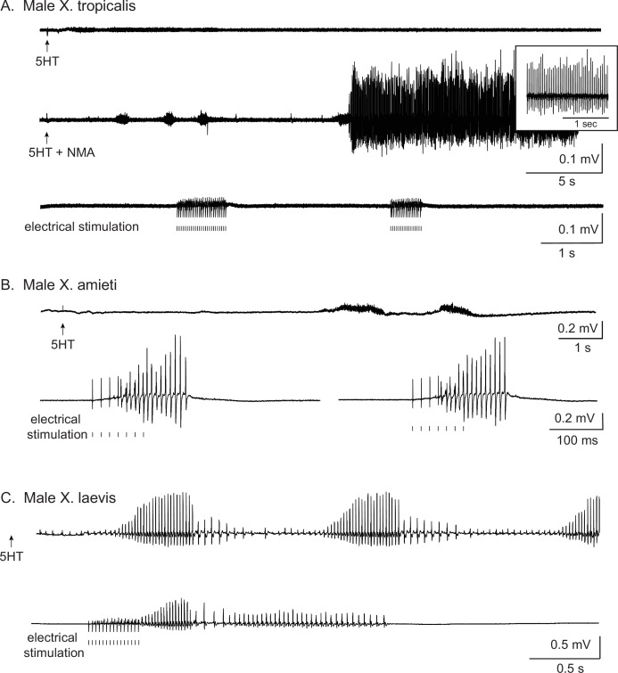 Figure 1—figure supplement 1. Types of stimuli used to elicit fictive advertisement calls.All traces are laryngeal nerve recordings from isolated brain preparations. For all the figures, the upward arrows under the traces indicate the time at which 5HT or 5HT and NMA are applied, and the vertical lines indicate the time at which electrical pulses were delivered to the rostral lateral cerebellum (RLCB, Figure 1D). (A). The application of 5HT and NMA, but not 5HT alone nor electrical stimuli delivered to the RLCB elicit fictive advertisement calls from the brains of X. tropicalis. Top two traces are obtained from the brain of the same individual, and the bottom trace was obtained from another individual. (B). The electrical stimuli delivered to RLCB, but not the application of 5HT elicit fictive advertisement calls from the brains of X. amieti. All the recordings were obtained from the brain of the same individual. (C). Both the application of 5HT and the electrical stimulation delivered to the RLCB elicit fictive advertisement calls from the brains of male X. laevis. Both recordings were obtained from the brain of the same individual. The left-pointing arrow indicates that 5HT was applied to the brain two minutes before the beginning of the trace. |