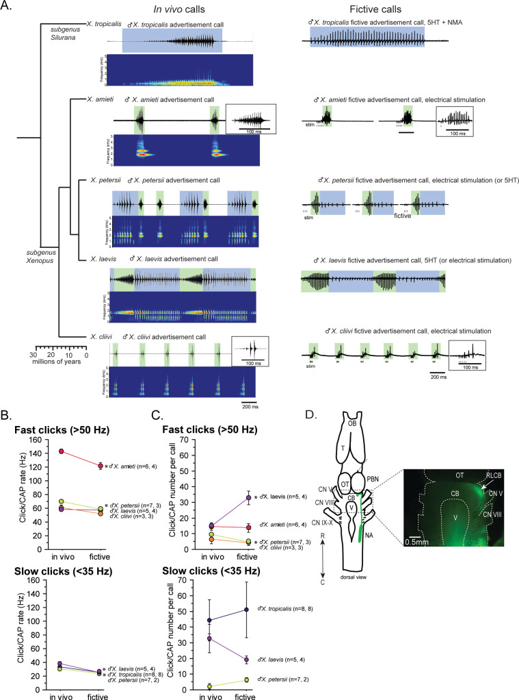 Figure 1. Phylogeny of five species of Xenopus and their advertisement calls.(A). Chronogram, in vivo vocalizations, and fictive vocalizations recorded from males of each species. Left column: chronogram based on mitochondrial DNA (Modified from Evans et al., 2015) of studied species. Middle column: amplitude envelope (top panel) and sound spectrogram (bottom panel) of in vivo advertisement calls. Right column: fictive advertisement calls recorded ex vivo from the isolated brain. The green and blue background of traces indicate fast (>50 Hz) and slow (<35 Hz) clicks, respectively, and the vertical lines below the fictive vocalizations labeled with ‘stim’ indicate electrical stimuli applied to the rostral-lateral cerebellum (RLCB, D) to elicit fictive calls in some brains. The type of stimulus following the species name indicates what was used to elicit the fictive calls shown, and those in parenthesis are other stimulus types that are also effective in eliciting fictive calls. (B). Comparison of click and compound action potential (CAP) rates of calls recorded in vivo and ex vivo from each species. Each circle with an error bar indicates the mean + s.e. of click or CAP rates (in Hz). For both B and C, asterisks preceding the species name indicate significant differences between the rates of clicks/CAPs produced in vivo and ex vivo. Note that some error bars are hidden behind the data points due to the small size. (C). The number of clicks/CAPS in a call recorded in vivo and ex vivo. Each circle with an error bar indicates the mean + s.e. of click/CAP number. The first and the second sample sizes after species name refers to in vivo and fictive data, respectively. (D). The location of the rostral-lateral cerebellum (RLCB), a site that is effective in eliciting fictive calls when stimulated electrically. Left; a cartoon showing the dorsal view of an isolated brain of Xenopus. The double headed arrow indicates rostral (R) and caudal (C) orientation of the brain. When dextran dye was injected into the nucleus ambiguus (NA), axons of projection neurons in the NA and the parabrachial nucleus (PBN) that project reciprocally to each other are labeled and can be viewed from the dorsal surface of the brain as seen in the photo on the right. The area at the lateral edge of the cerebellum (CB) along the labeled projections is the RLCB (white arrow). Delivering stimulus pulses to this area using a concentric electrode elicits fictive calls in most brains except in the brain of X. tropicalis. CB; cerebellum, CN V; cranial nerve V, NA; nucleus ambiguus, OB; olfactory bulb. OT; optic tectum, PB; parabrachial nucleus, T; telencephalon. |