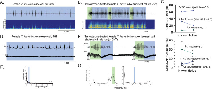 laevis becomes active after testosterone-induced vocal masculinization.(A, B) Amplitude envelope (top) and sound spectrogram (bottom) of a release call (A) and advertisement call (B) recorded in vivo from female X. laevis and testosterone-treated female X. laevis. The blue and green background behind the amplitude envelope indicates slow (<35 Hz) and fast (>50 Hz) clicks, respectively. (C) Click repetition rates and click number per call recorded in vivo and ex vivo from female X. laevis and testosterone-treated female X. laevis. Each triangle with an error bar indicates the mean ± s.e. of click repetition rate (top) and click number per call (bottom). The names of the animal preceded by an asterisk indicate a significant difference between the in vivo and fictive calls. The sample sizes following species name refer to in vivo and fictive data, respectively. (D, E) Fictive release call and advertisement calls recorded from an isolated brain of a female X. laevis and testosterone-treated female X. laevis. Top trace; laryngeal nerve recordings, bottom trace; local field potential (LFP) recordings obtained from the parabrachial nucleus (PBN). The blue and green background behind the amplitude envelope indicates slow (<35 Hz) and fast (>50 Hz) clicks, respectively. The type of stimulus following the species name indicates what was used to elicit the fictive calls shown, and that in parenthesis is another stimulus type that is also effective in eliciting fictive calls. Compare the PBN activity during fast trills to those recorded from the intact female during fictive release calling. (F, G) Mean power spectral density (PSD) of PBN LFP recordings during fictive release calling in female X. laevis (F) and fictive advertisement calling in testosterone-treated female X. laevis (G). Blue and green frames show the mean + std of the CAP rates for fictive release calls, slow trills, and fast trills. |