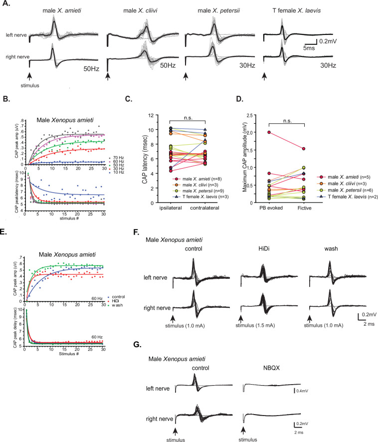 Figure 9. Properties of the synapses between the parabrachial nucleus (PBN) and laryngeal motoneurons in all fast clickers resemble those of male X.laevis.(A). PBN-evoked responses of the left (top panel) and right (bottom panel) laryngeal motor nerves shown as sweeps. Gray traces are raw data, and the thick black lines represent the mean response across 30 stimulus pulses. Arrows indicate the timing of stimulus onset, and the stimulus frequencies are shown below the traces. (B). PBN-evoked CAP amplitude (top graph) and the CAP latency (bottom graph) as a function of stimulus pulse order in response to stimulus trains (10–70 Hz) delivered to a PBN of a male X. amieti brain. Progressive increase in CAP amplitude and attenuation in CAP latency can be successfully fitted with exponential curves, as in male X. laevis. (C). PBN-evoked CAP latency recorded from the ipsilateral and contralateral nerve of all fast clickers. There was no significant difference in the latency between the two nerves. (D). Maximum CAP amplitude evoked in response to the unilateral PBN stimulation and those recorded during fictive advertisement calls. There was no significant difference in the maximum amplitude recorded under these two conditions. (E). Maximum CAP amplitude and the CAP latency as a function of the stimulus pulse number in control, HiDi saline, and washout in a male X. amieti brain. The progressive increase in CAP amplitude and the decrease in CAP latency were observed under all three conditions, indicating that they are monosynaptic. (F). Sweeps of left and right laryngeal nerves in response to the unilateral PBN stimulation in control (left), in the presence of HiDi saline (middle), and after wash. The arrows at the bottom show the timing of stimulus pulse delivery, with the stimulus frequency of 60 Hz in all three conditions. The amplitude used is shown in parenthesis. (G). Sweeps of left and right laryngeal nerves in response to the unilateral PBN stimulation at 60 Hz of male X. amieti in control (left), and in the presence of NBQX (right). The arrows at the bottom show the timing of stimulus pulse delivery. |