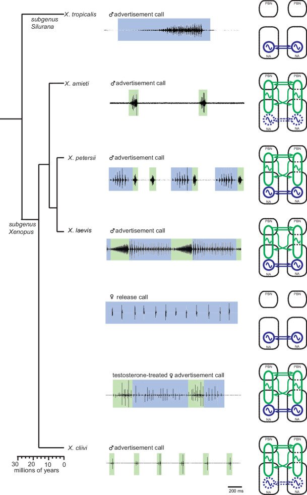 Figure 11. Summary of the two types of vocal central pattern generators with a conserved anatomical organization found in five species of genus Xenopus.Left column: chronogram based on mitochondrial DNA (Modified from Evans et al., 2015) of studied species. Middle column: fictive advertisement calls recorded ex vivo from the isolated brain. The green and blue background of traces indicate fast (>50 Hz) and slow (<35 Hz) clicks, respectively. Right column: schematics showing the types of central pattern generators (CPGs) thought to be contained in the brainstem of each species. A pair of parabrachial (PBN) and nucleus ambiguus (NA) are shown for each species, and the presence of slow CPGs (blue) and fast CPGs (green) are shown in each species, and in two sexes in the case of X. laevis. Dotted slow CPGs in X. amieti and X. cliivi indicate that their presence is yet to be tested in these species. |