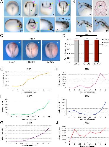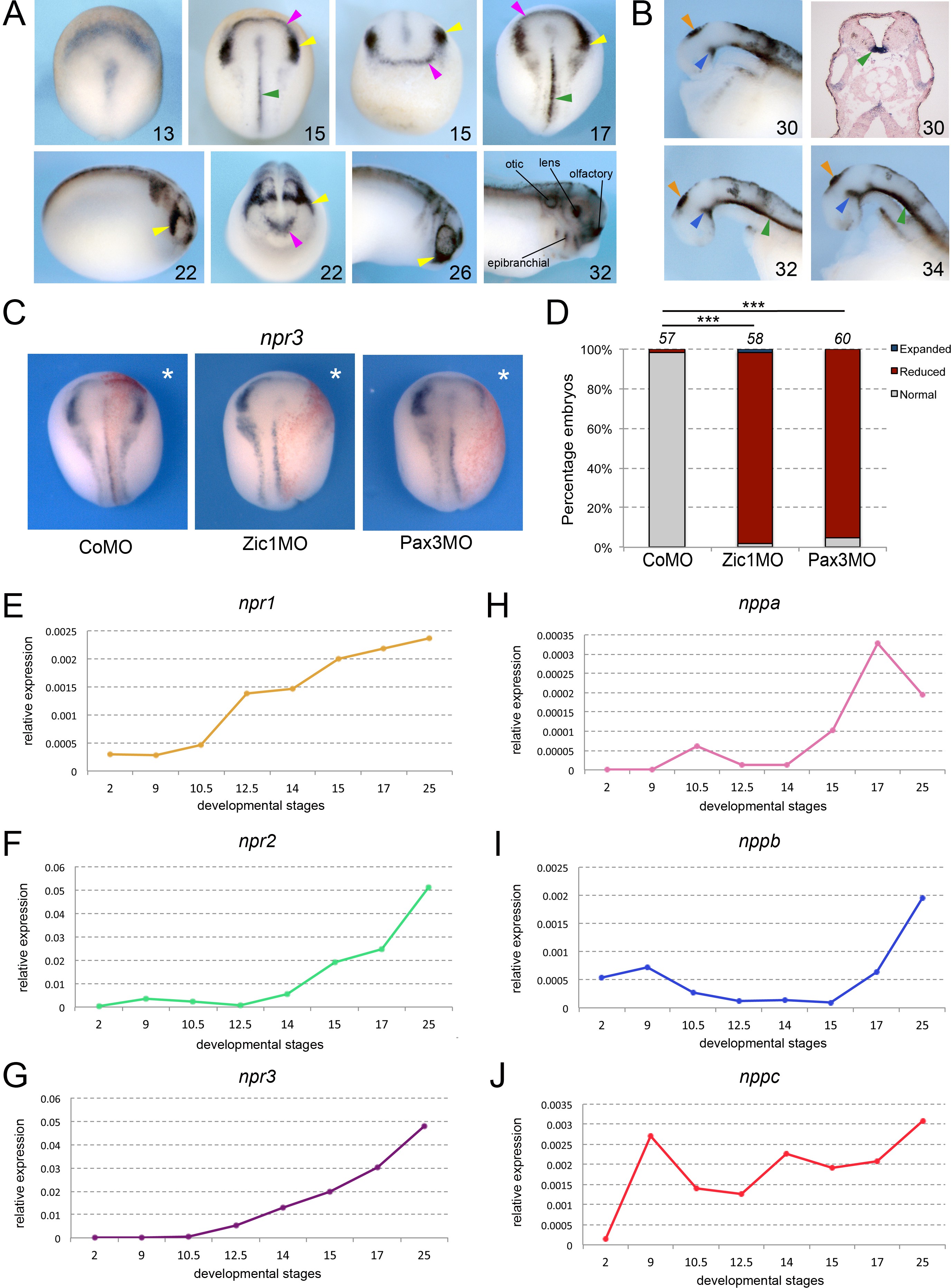Figure 1. Npr3, a target of Pax3 and Zic1, is expressed in developing NC and CP. (A) By ISH, npr3 is detected at the neural plate border at neurula stages (NF stage 1317), and persists in the NC (yellow arrowheads) and CP (purple arrowheads) forming regions (NF stage 2226). npr3 expression is maintained in most CP-derivatives at NF stage 32. (B) Dissected brain regions at NF stages 3034 show additional npr3 expression domains in the floor plate (green arrowheads), zona limitans intrathalamica (blue arrowheads) and pineal gland (orange arrowheads). Upper right shows a transverse section through the hindbrain of a NF stage 30 embryo highlighting the floor plate expression of npr3 (green arrowhead). The embryonic stages are indicated in the lower right corner of each panel. (C) Zic1 (Zic1MO) or Pax3 (Pax3MO) knockdown reduces npr3 expression at the NPB. Injection of a CoMO did not affect npr3 expression. The asterisks (*) mark the injected side, also visualized by the lineage tracer Red-gal. Dorsal views, anterior to top. (D) Frequency of the phenotypes. The number of embryos analyzed is indicated at the top of each bar. ***p<0.0005, [Chi-squared] test.(EJ) Developmental qRT-PCR expression profile of npr1 (E), npr2 (F), npr3 (G), nppa (H), nppb (I) and nppc (J) in Xenopus. NF developmental stages are indicated on the x-axis, values are normalized to ornithine decarboxylase (odc). A representative experiment is shown. Two additional biological replicates are shown in Figure S1 |